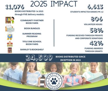 With the Barkley’s Bookshelf book fair, we bring the books to you! Volunteers curate books by age and genre to provide a variety of popular titles from which young readers select books to keep forever. We partner with Title 1 schools and nonprofits such as the Hope Centers, Boys & Girls Country, and Cy-Fair Helping Hands for book distribution through book fairs.